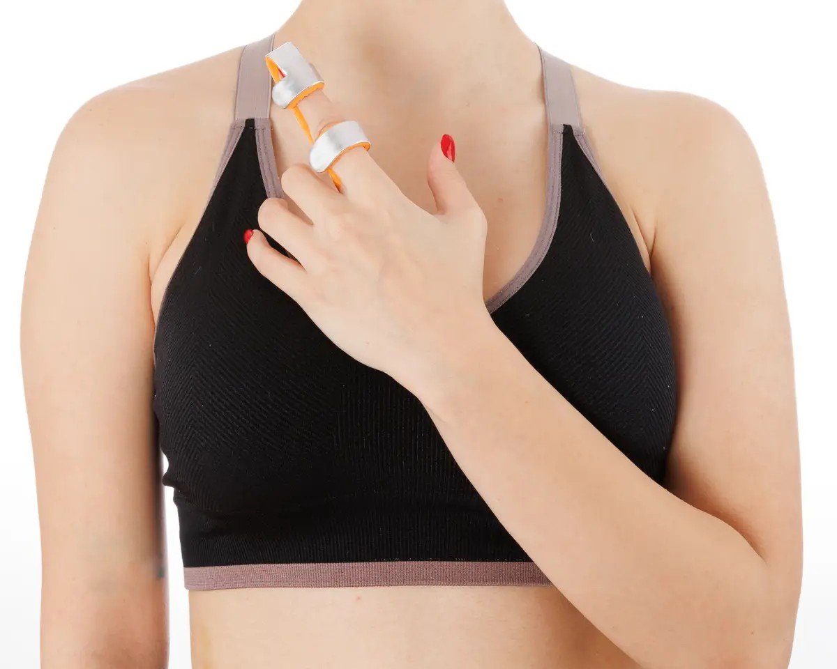 The inside is covered with plastozote. Aluminum support provides immobilization of the finger in extension.