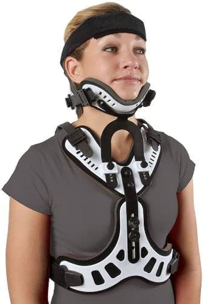 A corset that extends to the lower costal margin. Provides good control of all cervical motion. Includes adjustable heigh. The dorsal part allows the patient to sleep on his/her back without being disturbed. Provides more movement restriction with respect to philadelphia.